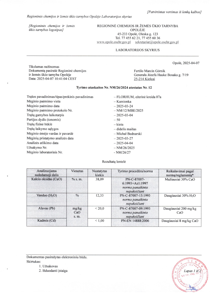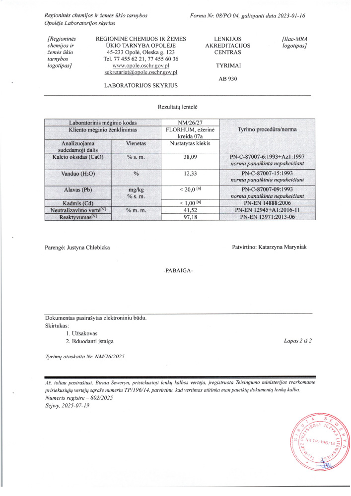 Kalcio trąšos, pagamintos iš aukštai reaktyvios ežerų kreidos, kuri pasižymi didele maistinių medžiagų, tokių kaip N, P, K, Mg, S, Na, Cu, Zn, Fe, Mn, B, koncentracija. Efektyviai skatina dirvožemio mikroorganizmų vystymąsi, stipriai stimuliuoja biologinį gyvenimą dirvoje. 07a kreida savo sudėtyje turi organinį anglies kiekį ir huminines rūgštis, todėl padeda skaidyti pasėlių likučius. Gerina augalų šaknų vystymąsi ir pagerina vandens sulaikymą dirvoje. Trąšas galima naudoti visų žemės ūkio, sodininkystės ir daržininkystės kultūrų auginimui.